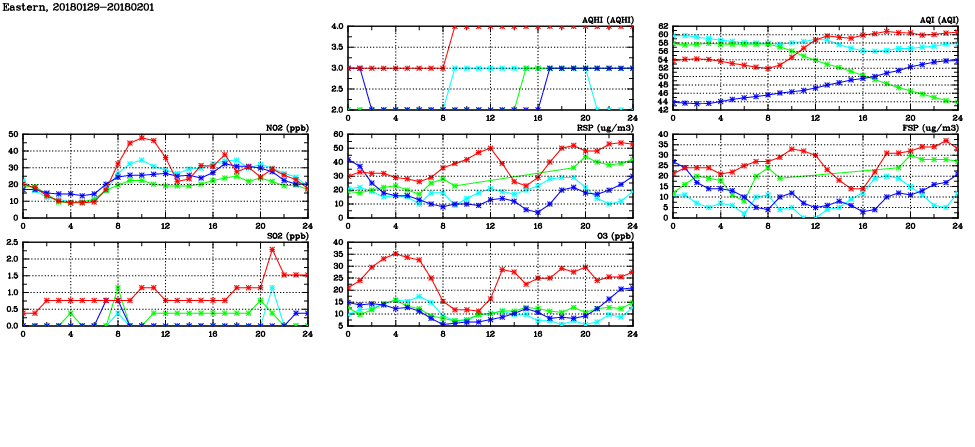 | Air Quality Data Time Series in Eastern (2018/02/01) | ( Line colors: Day -3 Day -2 Day -1 Current day ) | 2D Map Current AQHI |