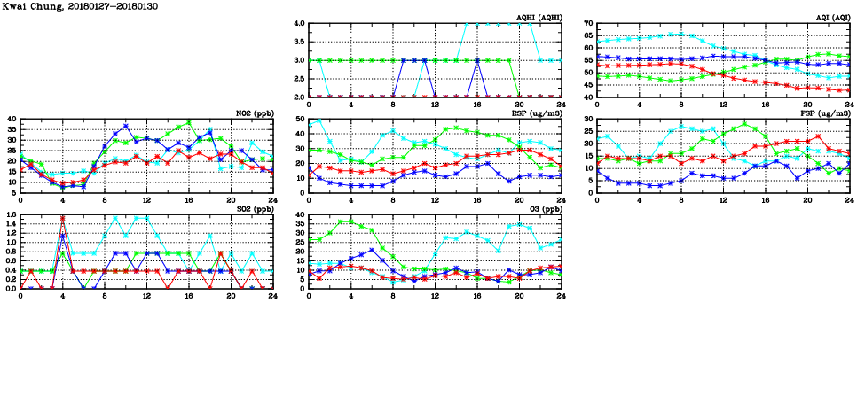| Air Quality Data Time Series in Kwai Chung (2018/01/30) | ( Line colors: Day -3 Day -2 Day -1 Current day ) | 2D Map Current AQHI |