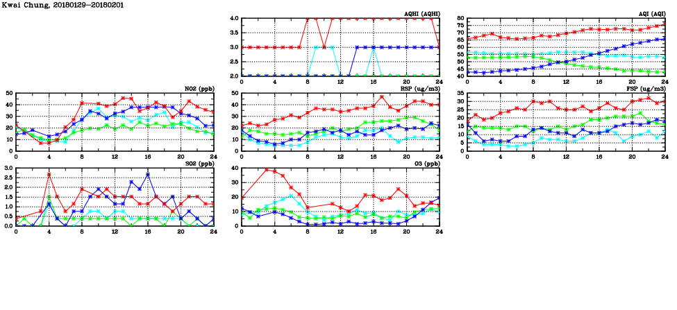 | Air Quality Data Time Series in Kwai Chung (2018/02/01) | ( Line colors: Day -3 Day -2 Day -1 Current day ) | 2D Map Current AQHI |