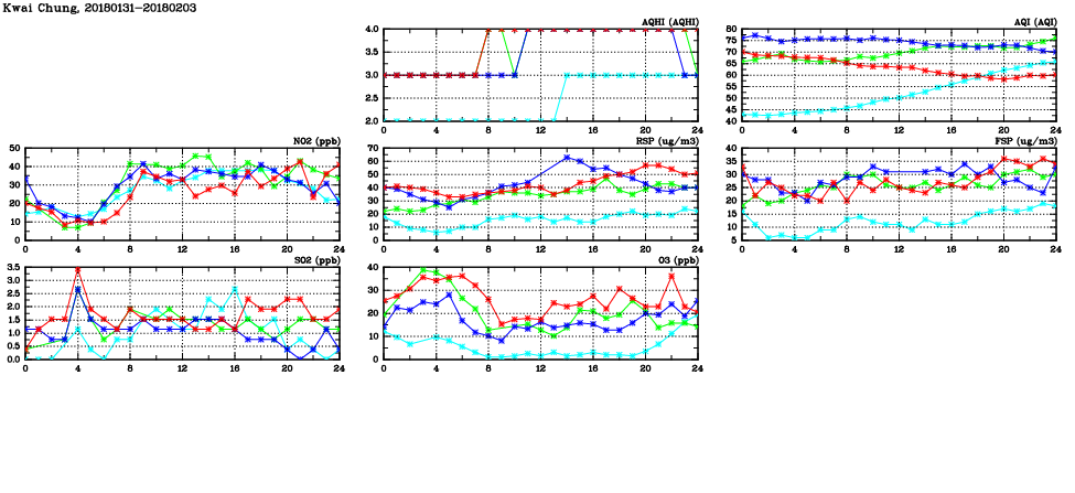 | Air Quality Data Time Series in Kwai Chung (2018/02/03) | ( Line colors: Day -3 Day -2 Day -1 Current day ) | 2D Map Current AQHI |