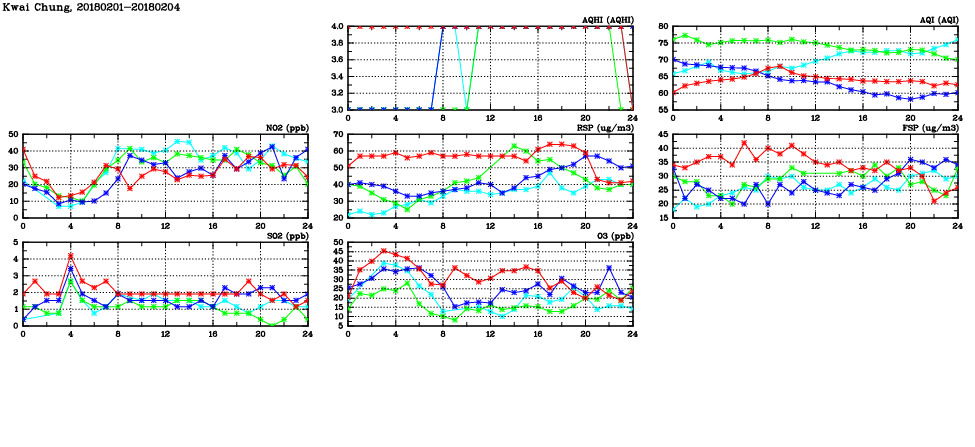 | Air Quality Data Time Series in Kwai Chung (2018/02/04) | ( Line colors: Day -3 Day -2 Day -1 Current day ) | 2D Map Current AQHI |