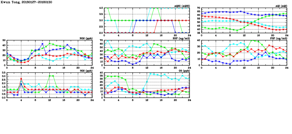 | Air Quality Data Time Series in Kwun Tong (2018/01/30) | ( Line colors: Day -3 Day -2 Day -1 Current day ) | 2D Map Current AQHI |