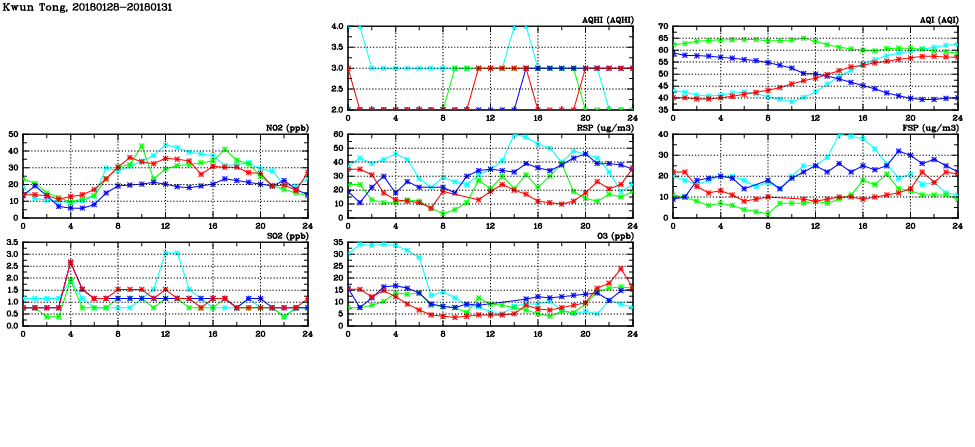 | Air Quality Data Time Series in Kwun Tong (2018/01/31) | ( Line colors: Day -3 Day -2 Day -1 Current day ) | 2D Map Current AQHI |