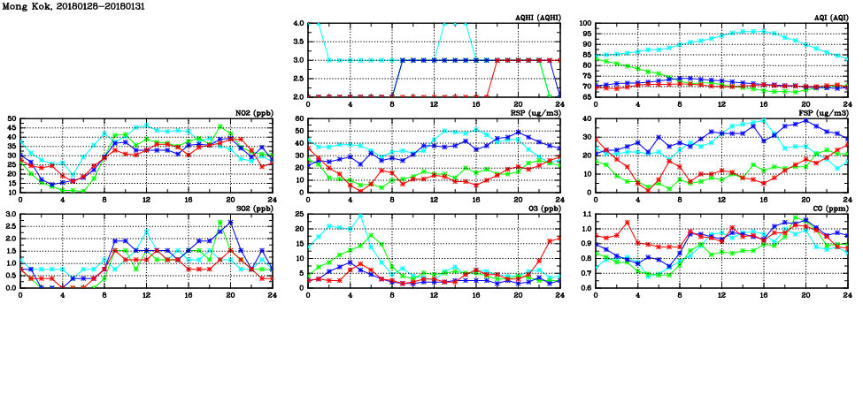 | Air Quality Data Time Series in Mong Kok (2018/01/31) | ( Line colors: Day -3 Day -2 Day -1 Current day ) | 2D Map Current AQHI |