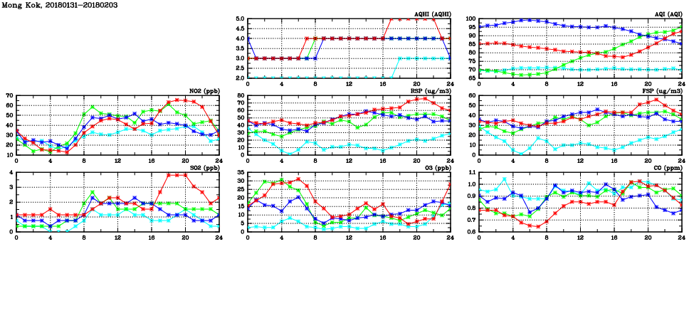 | Air Quality Data Time Series in Mong Kok (2018/02/03) | ( Line colors: Day -3 Day -2 Day -1 Current day ) | 2D Map Current AQHI |