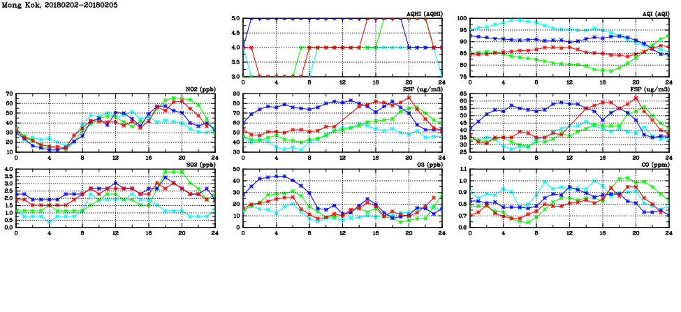 | Air Quality Data Time Series in Mong Kok (2018/02/05) | ( Line colors: Day -3 Day -2 Day -1 Current day ) | 2D Map Current AQHI |