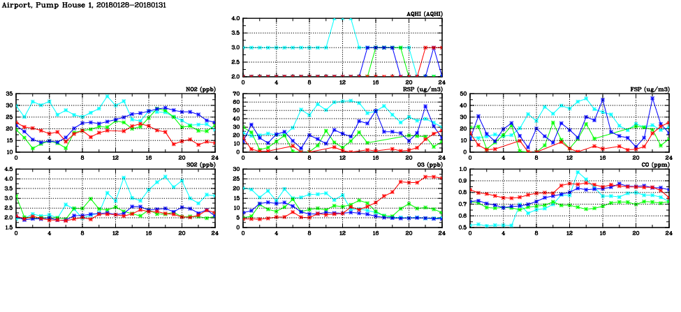| Air Quality Data Time Series in Airport, Pump House 1 (2018/01/31) | ( Line colors: Day -3 Day -2 Day -1 Current day ) | 2D Map Current AQHI |