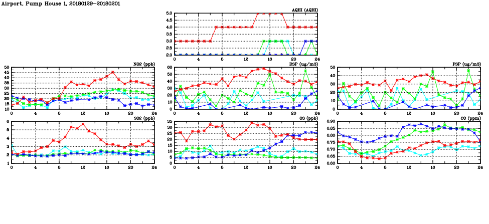 | Air Quality Data Time Series in Airport, Pump House 1 (2018/02/01) | ( Line colors: Day -3 Day -2 Day -1 Current day ) | 2D Map Current AQHI |