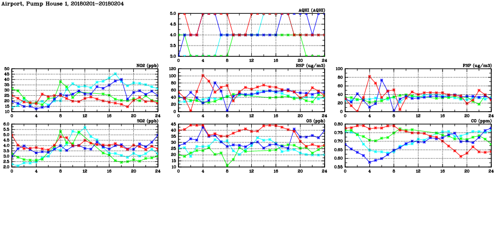 | Air Quality Data Time Series in Airport, Pump House 1 (2018/02/04) | ( Line colors: Day -3 Day -2 Day -1 Current day ) | 2D Map Current AQHI |