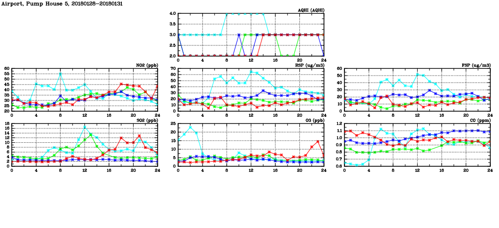 | Air Quality Data Time Series in Airport, Pump House 5 (2018/01/31) | ( Line colors: Day -3 Day -2 Day -1 Current day ) | 2D Map Current AQHI |