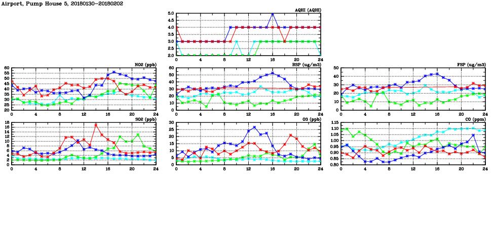 | Air Quality Data Time Series in Airport, Pump House 5 (2018/02/02) | ( Line colors: Day -3 Day -2 Day -1 Current day ) | 2D Map Current AQHI |