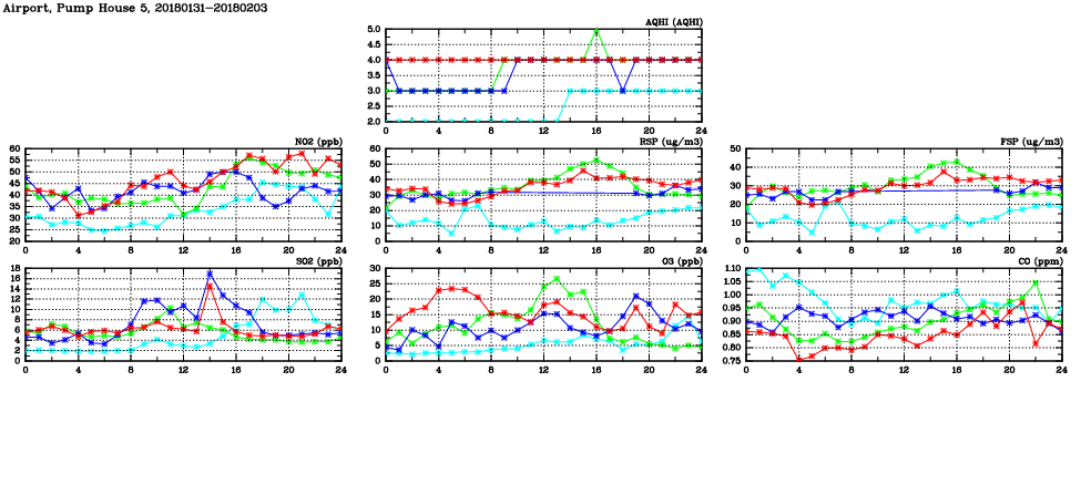 | Air Quality Data Time Series in Airport, Pump House 5 (2018/02/03) | ( Line colors: Day -3 Day -2 Day -1 Current day ) | 2D Map Current AQHI |