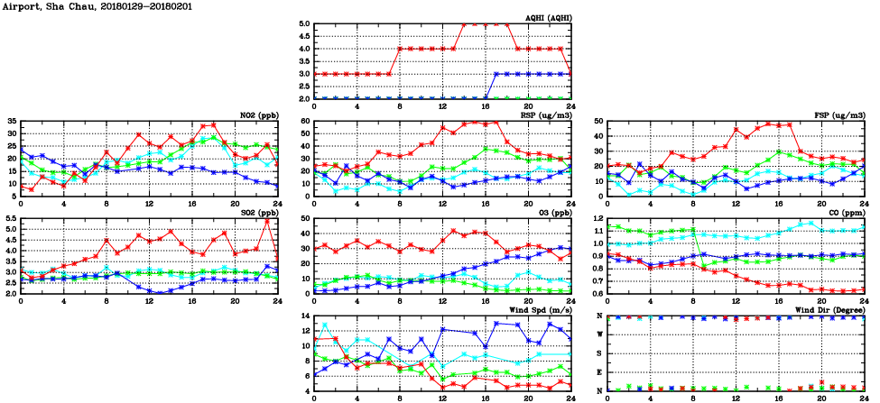 | Air Quality Data Time Series in Airport, Sha Chau (2018/02/01) | ( Line colors: Day -3 Day -2 Day -1 Current day ) | 2D Map Current AQHI |
