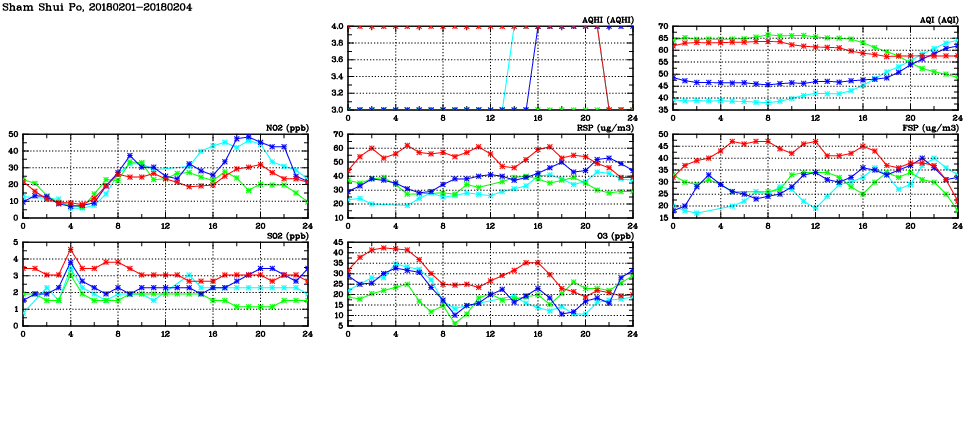 | Air Quality Data Time Series in Sham Shui Po (2018/02/04) | ( Line colors: Day -3 Day -2 Day -1 Current day ) | 2D Map Current AQHI |