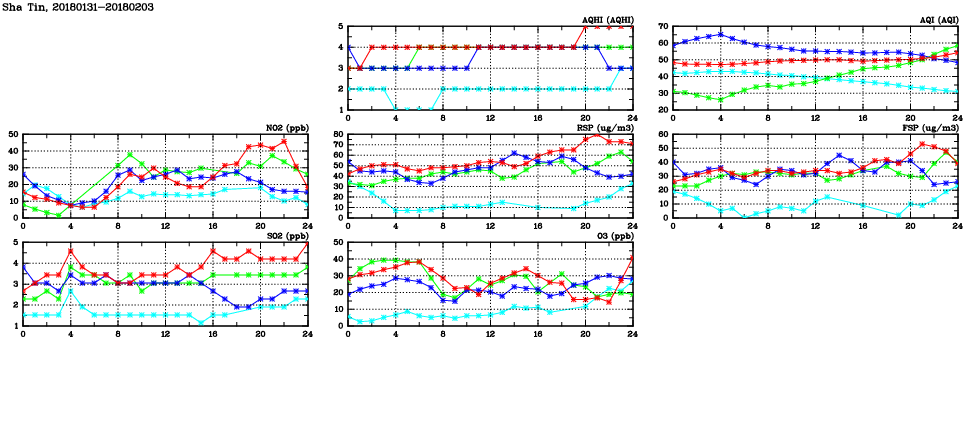 | Air Quality Data Time Series in Sha Tin (2018/02/03) | ( Line colors: Day -3 Day -2 Day -1 Current day ) | 2D Map Current AQHI |