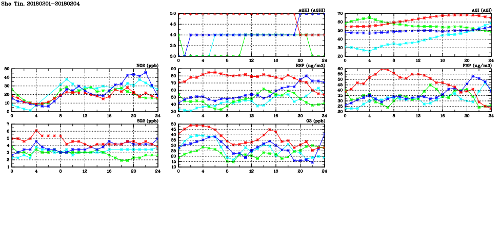 | Air Quality Data Time Series in Sha Tin (2018/02/04) | ( Line colors: Day -3 Day -2 Day -1 Current day ) | 2D Map Current AQHI |