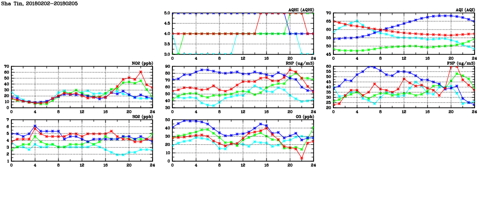 | Air Quality Data Time Series in Sha Tin (2018/02/05) | ( Line colors: Day -3 Day -2 Day -1 Current day ) | 2D Map Current AQHI |