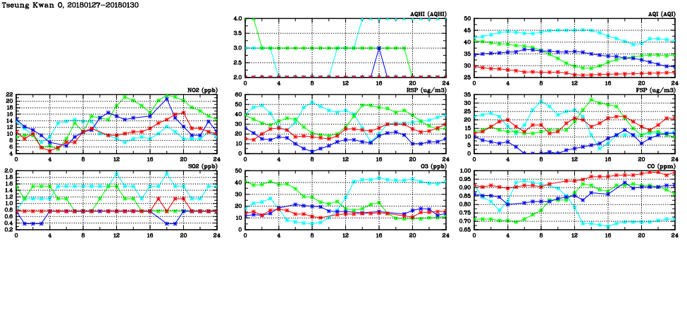 | Air Quality Data Time Series in Tseung Kwan O (2018/01/30) | ( Line colors: Day -3 Day -2 Day -1 Current day ) | 2D Map Current AQHI |