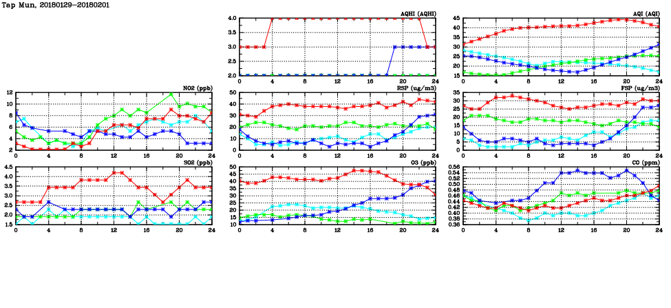 | Air Quality Data Time Series in Tap Mun (2018/02/01) | ( Line colors: Day -3 Day -2 Day -1 Current day ) | 2D Map Current AQHI |