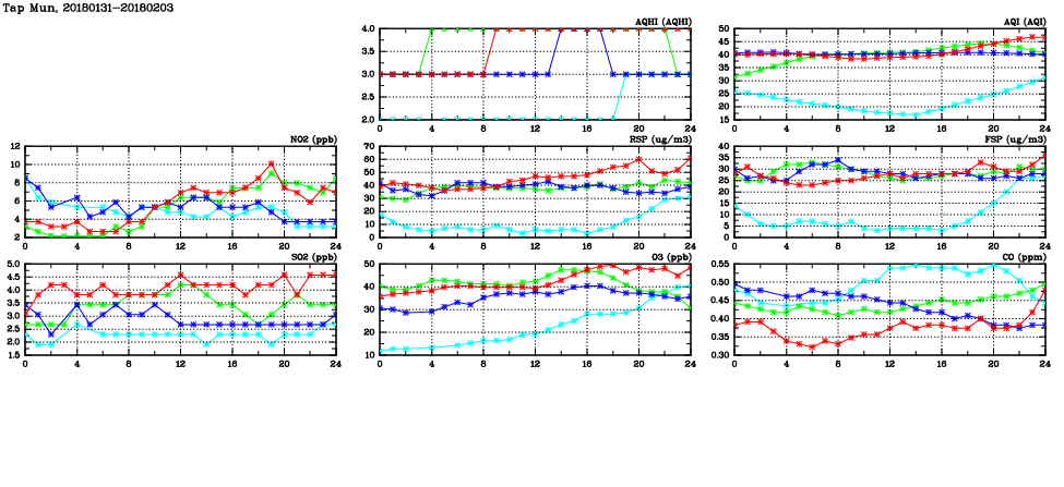 | Air Quality Data Time Series in Tap Mun (2018/02/03) | ( Line colors: Day -3 Day -2 Day -1 Current day ) | 2D Map Current AQHI |
