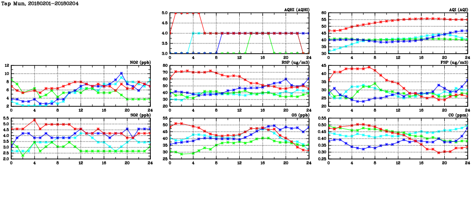 | Air Quality Data Time Series in Tap Mun (2018/02/04) | ( Line colors: Day -3 Day -2 Day -1 Current day ) | 2D Map Current AQHI |