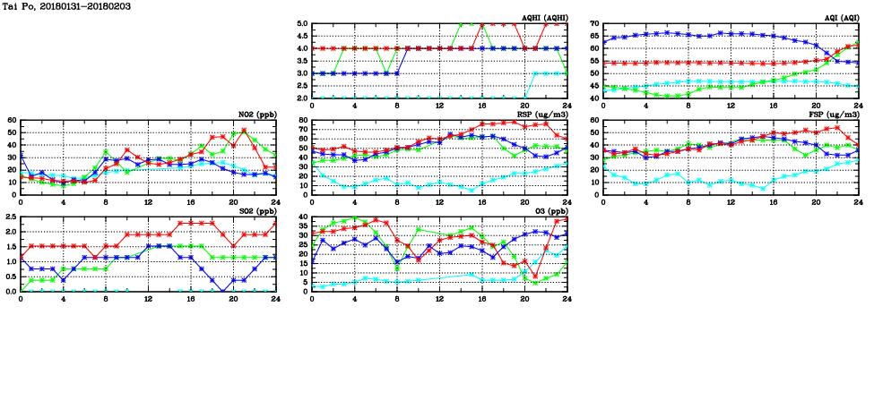 | Air Quality Data Time Series in Tai Po (2018/02/03) | ( Line colors: Day -3 Day -2 Day -1 Current day ) | 2D Map Current AQHI |