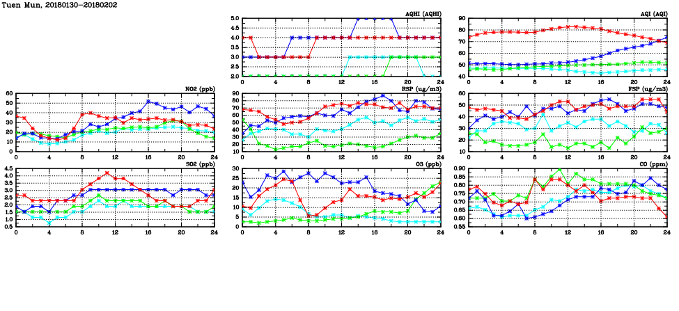 | Air Quality Data Time Series in Tuen Mun (2018/02/02) | ( Line colors: Day -3 Day -2 Day -1 Current day ) | 2D Map Current AQHI |