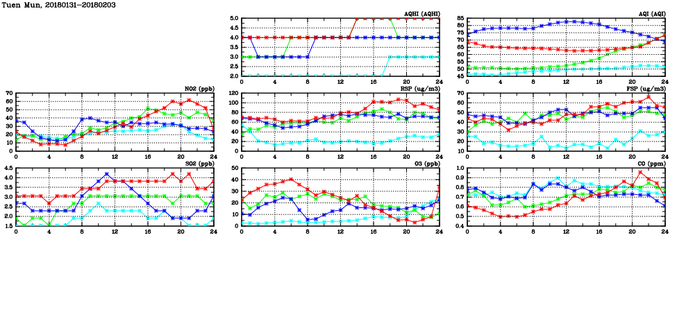 | Air Quality Data Time Series in Tuen Mun (2018/02/03) | ( Line colors: Day -3 Day -2 Day -1 Current day ) | 2D Map Current AQHI |