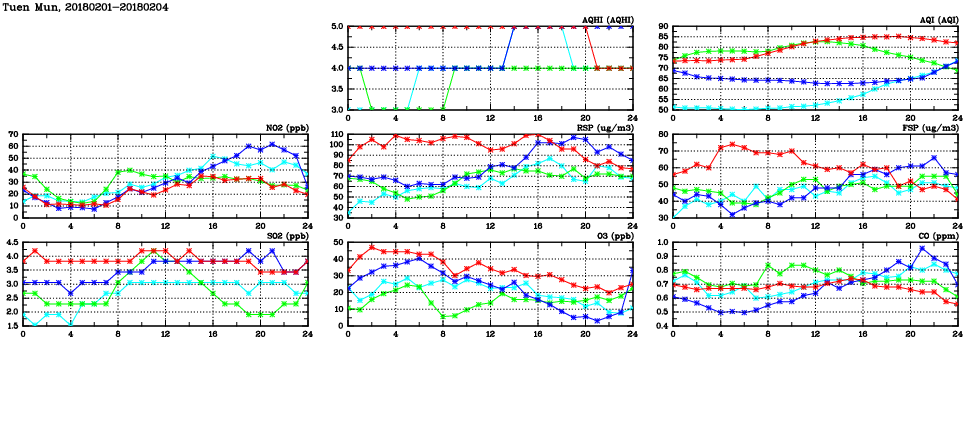 | Air Quality Data Time Series in Tuen Mun (2018/02/04) | ( Line colors: Day -3 Day -2 Day -1 Current day ) | 2D Map Current AQHI |