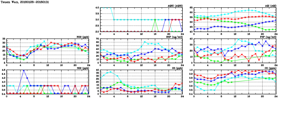 | Air Quality Data Time Series in Tsuen Wan (2018/01/31) | ( Line colors: Day -3 Day -2 Day -1 Current day ) | 2D Map Current AQHI |