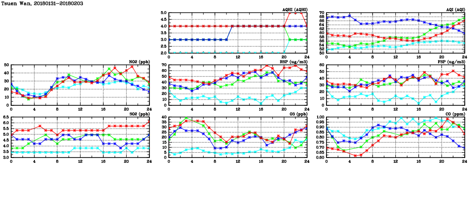 | Air Quality Data Time Series in Tsuen Wan (2018/02/03) | ( Line colors: Day -3 Day -2 Day -1 Current day ) | 2D Map Current AQHI |
