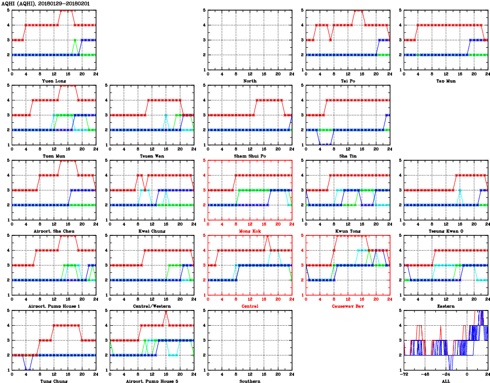 | Air Quality Data Time Series for AQHI (2018/02/01) | ( Line colors: Day -3 Day -2 Day -1 Current day ) | 2D Map Current AQHI |