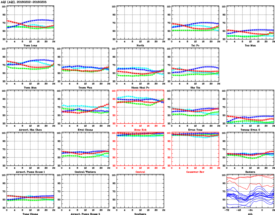 | Air Quality Data Time Series for AQI (2018/02/05) | ( Line colors: Day -3 Day -2 Day -1 Current day ) | 2D Map Current AQHI |