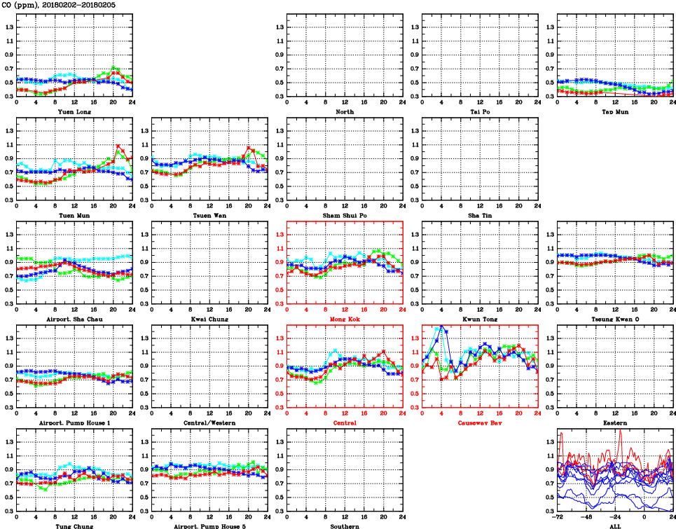 | Air Quality Data Time Series for CO (2018/02/05) | ( Line colors: Day -3 Day -2 Day -1 Current day ) | 2D Map Current AQHI |