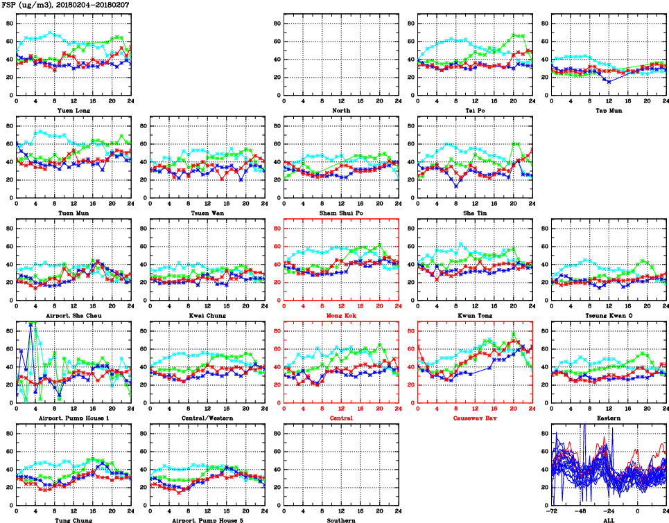 | Air Quality Data Time Series for FSP (2018/02/07) | ( Line colors: Day -3 Day -2 Day -1 Current day ) | 2D Map Current AQHI |
