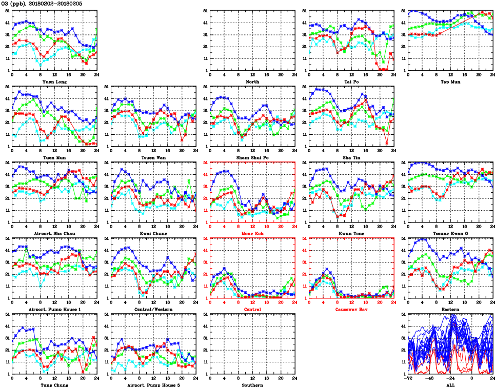 | Air Quality Data Time Series for O3 (2018/02/05) | ( Line colors: Day -3 Day -2 Day -1 Current day ) | 2D Map Current AQHI |