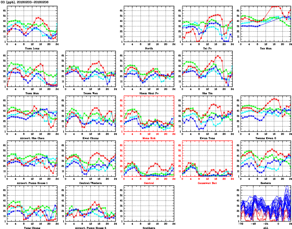 | Air Quality Data Time Series for O3 (2018/02/06) | ( Line colors: Day -3 Day -2 Day -1 Current day ) | 2D Map Current AQHI |