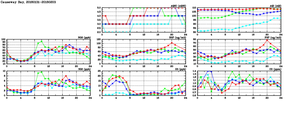 | Air Quality Data Time Series in Causeway Bay (2018/02/03) | ( Line colors: Day -3 Day -2 Day -1 Current day ) | 2D Map Current AQHI |