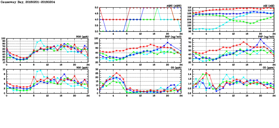 | Air Quality Data Time Series in Causeway Bay (2018/02/04) | ( Line colors: Day -3 Day -2 Day -1 Current day ) | 2D Map Current AQHI |