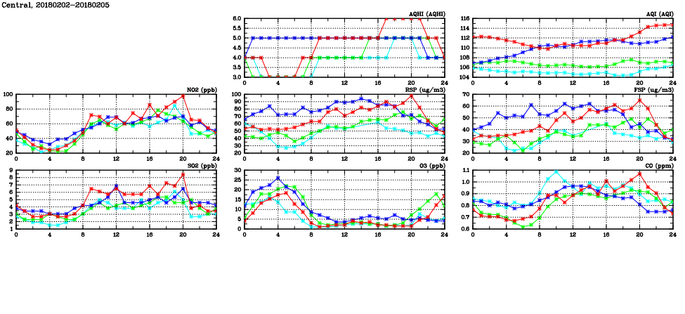| Air Quality Data Time Series in Central (2018/02/05) | ( Line colors: Day -3 Day -2 Day -1 Current day ) | 2D Map Current AQHI |
