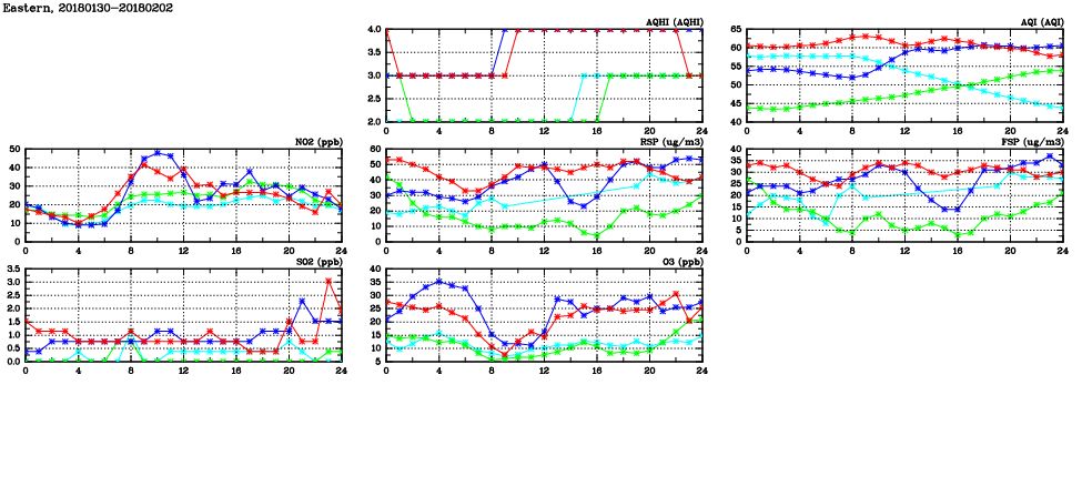 | Air Quality Data Time Series in Eastern (2018/02/02) | ( Line colors: Day -3 Day -2 Day -1 Current day ) | 2D Map Current AQHI |