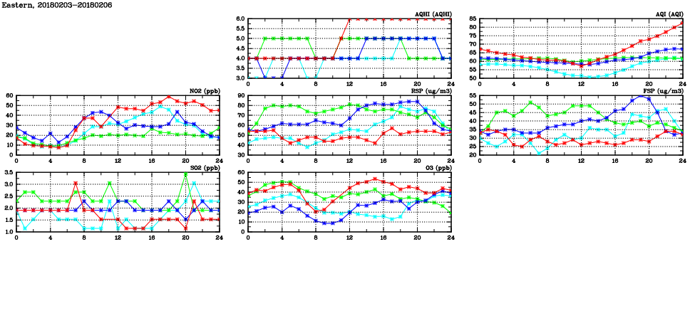 | Air Quality Data Time Series in Eastern (2018/02/06) | ( Line colors: Day -3 Day -2 Day -1 Current day ) | 2D Map Current AQHI |