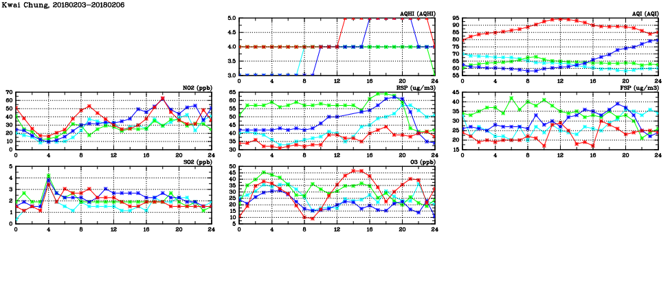 | Air Quality Data Time Series in Kwai Chung (2018/02/06) | ( Line colors: Day -3 Day -2 Day -1 Current day ) | 2D Map Current AQHI |