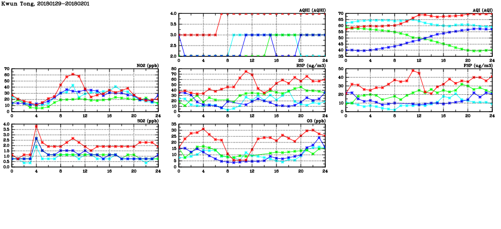 | Air Quality Data Time Series in Kwun Tong (2018/02/01) | ( Line colors: Day -3 Day -2 Day -1 Current day ) | 2D Map Current AQHI |