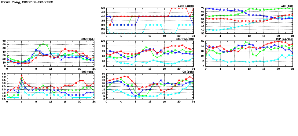 | Air Quality Data Time Series in Kwun Tong (2018/02/03) | ( Line colors: Day -3 Day -2 Day -1 Current day ) | 2D Map Current AQHI |