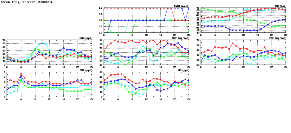 | Air Quality Data Time Series in Kwun Tong (2018/02/04) | ( Line colors: Day -3 Day -2 Day -1 Current day ) | 2D Map Current AQHI |