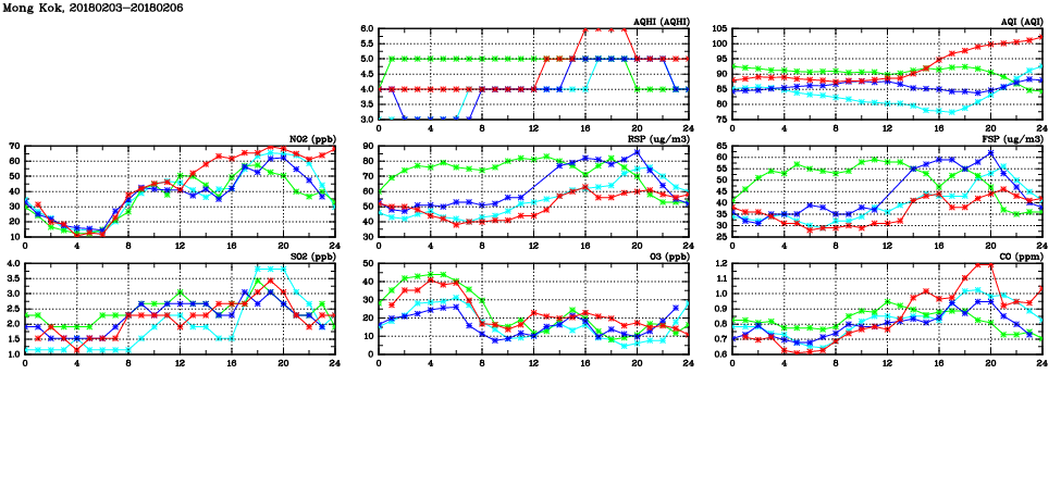 | Air Quality Data Time Series in Mong Kok (2018/02/06) | ( Line colors: Day -3 Day -2 Day -1 Current day ) | 2D Map Current AQHI |