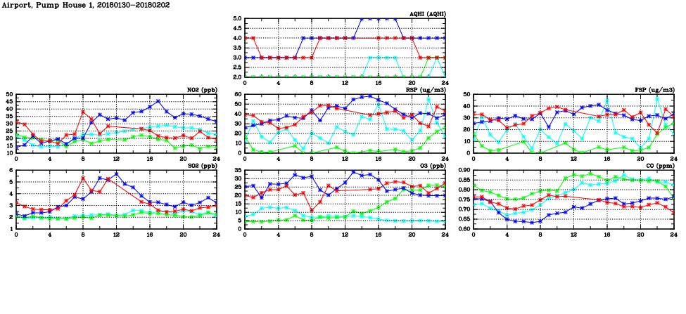 | Air Quality Data Time Series in Airport, Pump House 1 (2018/02/02) | ( Line colors: Day -3 Day -2 Day -1 Current day ) | 2D Map Current AQHI |