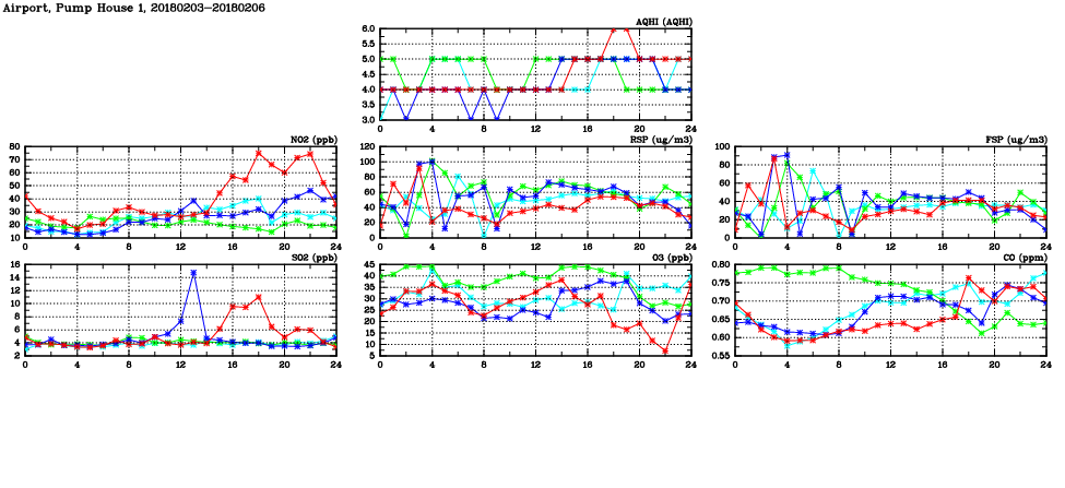 | Air Quality Data Time Series in Airport, Pump House 1 (2018/02/06) | ( Line colors: Day -3 Day -2 Day -1 Current day ) | 2D Map Current AQHI |