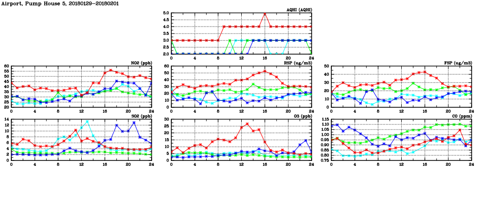 | Air Quality Data Time Series in Airport, Pump House 5 (2018/02/01) | ( Line colors: Day -3 Day -2 Day -1 Current day ) | 2D Map Current AQHI |